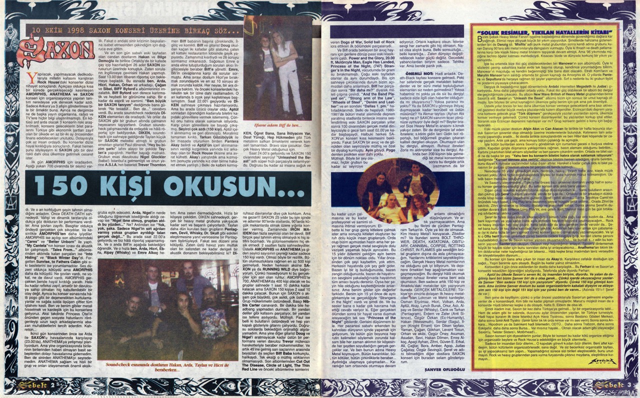 Günlerden 10 Ekim 1998, Saxon nihayet Türkiye’deki ilk ve şimdilik tek konserini verdi. Ondan da evvel Erzincan depremi yararına bir konser için getirilecek olan, ancak kimi köşe ve müzik yazarlarının “Saxon grubu Türk düşmanıdır!” şeklindeki kışkırtmalı yazıları neticesinde organizatörlerin tepkilerden korkarak konserini iptal ettiği Saxon seyircisiyle buluştu buluşmasına ama, bu buluşma ülkemizdeki heavy metal geçmişinin karanlık, efsanevi ve aynı anda avuntulu bir parçasını oluşturmuştu. Öncelikle organizasyon takvim belirleme ve konserlerin tanıtımı konusunda oldukça yetersiz bulunmuş. Mevzunun adı, “Rock House Konserler Dizisi”; diğer günlerde Amorphis ve Anathema var. Diğer günler yedi yüz beş yüz derken fena geçmemiş, lakin Diken ve Saxon’dan oluşan üçüncü gün, “hakiki metal” günü kaç kişi varmış dersiniz? Yuvarlak hesapla 150 kişi. Buna rağmen Saxon sahneden inmek bilmemiş, bis üstüne bis yapmış ve belki de Türkiye’deki konserler arasında bir bis rekoru kırmış, 2 saatin üzerinde bir performans sergilemiş. Bu 150 kişi haricindekiler bütün bunlardan ilk olarak Şebek’in 18 Ekim 1998 tarihli sayısı ile haberdar oldu. Türkiye’deki heavy metal dergiciliğinin en efsane yazarlarından Şanver Ofluoğlu’nun kaleme aldığı en efsane yazılardan birinin başlığıydı “150 Kişi Okusun…”. Konserler dizisi süresince başına gelen aksilikler, Biff Byford ile yaptığı sohbetler, konserde olan bitenler… Kızgınlıkları, gelmeyen dinleyicilere sitemleri, konser heyecanı, hayatının anlamı… Ve yazının zirve yaptığı cümleler: “Ayin gibiydi. Pogo denilen pislikten eser dahi yoktu.”…